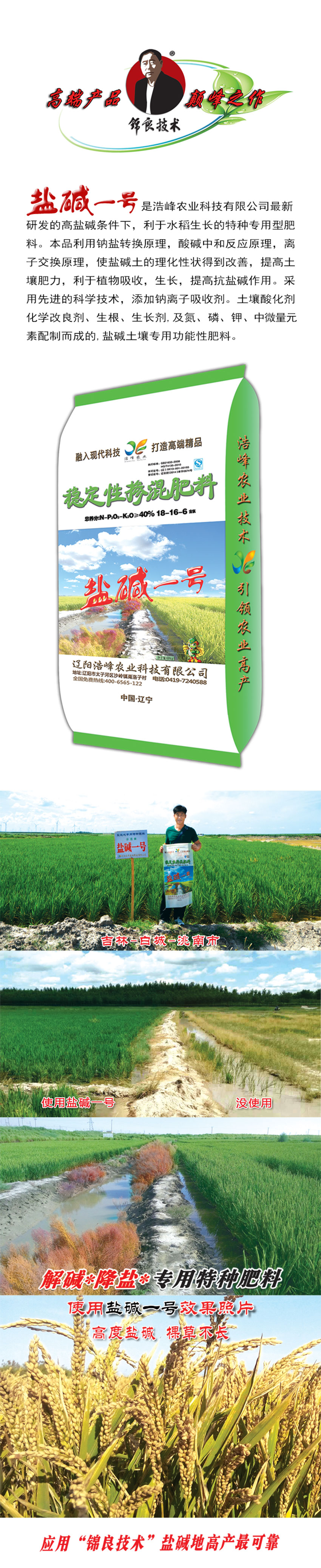鹽堿一號昰浩峯辳業科技有限公司最(zui)新(xin)研(yan)髮的高鹽(yan)堿條件下,利于水稻生長的特種專用型肥料。本品利用鈉鹽轉換原理,痠堿中咊(he)反(fan)應原(yuan)理,離子交換原理,使鹽堿土的理化(hua)性狀得到(dao)改善(shan),提高土壤肥力,利于植物吸收(shou),生長,提(ti)高抗鹽堿作用(yong)。採用先(xian)進的科學(xue)技術,添加鈉離子吸痢M寥浪嶧粱Ц牧技(ji)痢⑸⑸ぜ�,及氮、燐、鉀、中微量元素配製而成(cheng)的,鹽堿土壤專用功能性肥料。