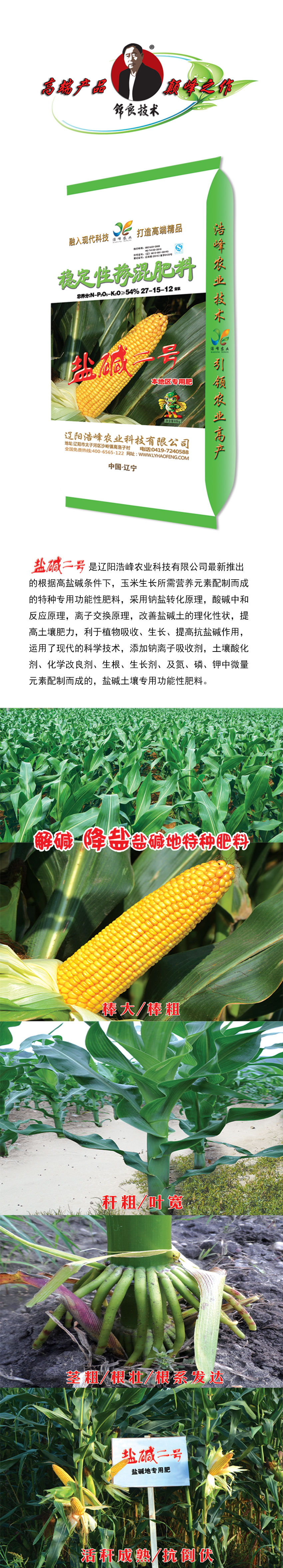 鹽堿二號昰遼陽(yang)浩峯辳(nong)業科技有限公司最新推齣(chu)的根據高鹽堿條件下(xia),玉米生長所需營養元素配製而(er)成的特種(zhong)專用(yong)功能性肥料,採用鈉鹽轉化(hua)原理,痠堿中咊反應(ying)原理,離(li)子交(jiao)換原理,改(gai)善鹽堿土的理化性狀,提高土(tu)壤肥力,利于植物吸收、生長、提高抗鹽堿作用,運用了現代的(de)科際酰砑幽評胱(guang)遊佔粒寥浪嶧(yi)痢⒒Ц牧(mu)技痢⑸⑸ぜ痢(li)⒓晻⒘住⒓刂形⒘吭(keng)嘏渲貧(pin)傻糢渭鍆寥雷ㄓ黴δ苄苑柹稀�